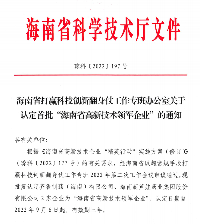 近日,海南省科学技术厅发布的《海南省打赢科技创新翻身仗工作专班办公室关于认定首批“海南省高新技术领军企业”的通知》中显示,批复认定海南PA旗舰厅药业集团股份有限公司等2家企业为“海南省高新技术领军企业”。认定日期自2022年9月6日起,有效期三年。