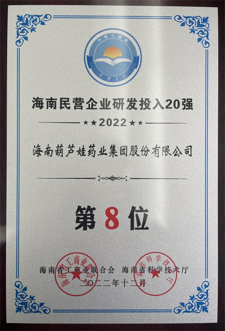 12月23日,2022海南民营企业50强和研发投入20强发布会在海口举行。会上发布了“2022海南民营企业50强”“2022海南民营企业研发投入20强”榜单和分析报告。PA旗舰厅药业再次荣登两榜,在海南民营企业50强榜单中位列第25位,较去年上升8位,这也是公司连续三年登榜;在海南民营企业研发投入20强中位列第8位,较去年上升7位。